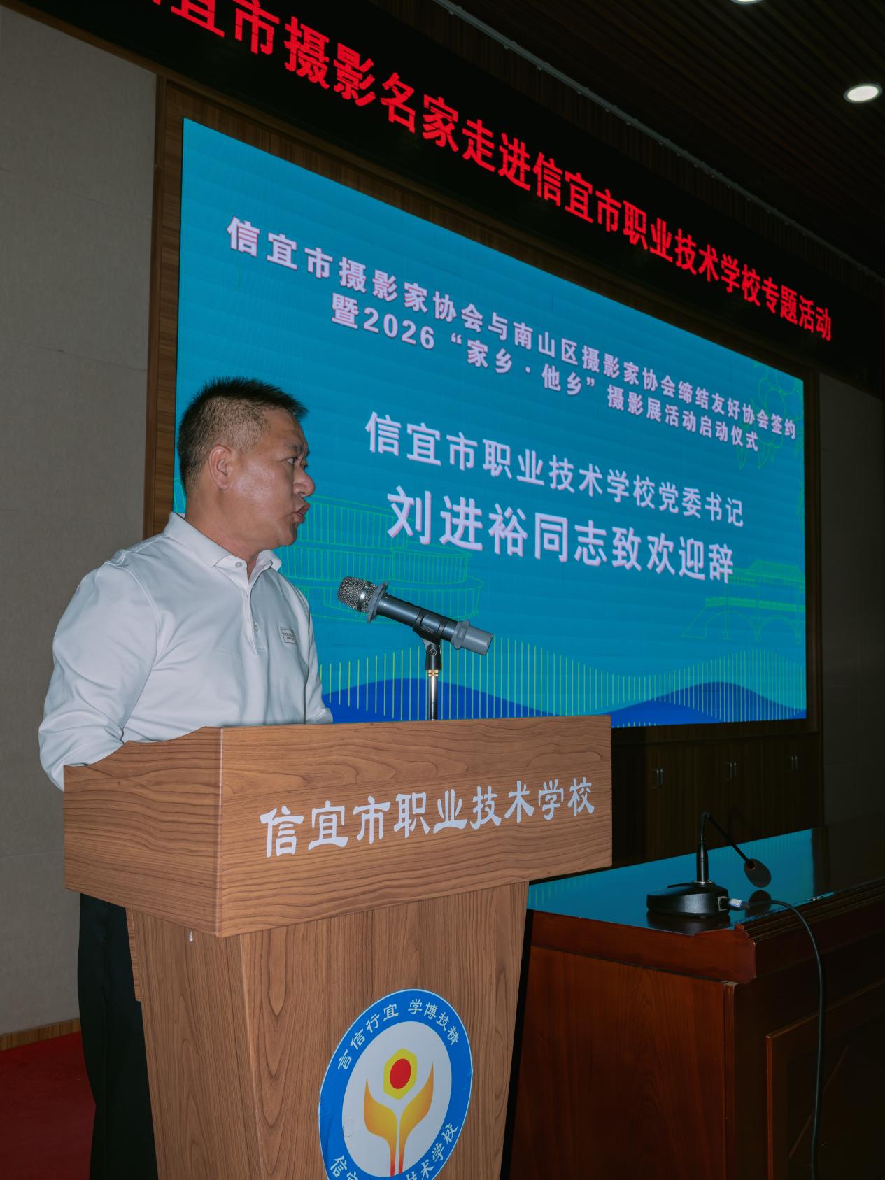 信宜职校党委书记刘进裕在致辞中热情欢迎两地摄影家,他表示,信宜素有“中国李乡,山水信宜”之美誉,兼具自然灵秀与人文底蕴;学校作为职业教育阵地,始终坚持文化育人,此次艺术交流正是“他乡”艺术与“家乡”情怀的美丽相遇。
