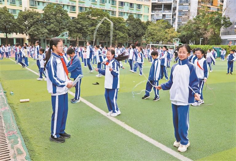 值得一提的是,跨年级“大手牵小手”伴护机制成为亮点。晨练时,操场一侧的AI智能运动屏前,六年级“学长团”带领二三四年级学生跳绳,根据AI数据反馈,提供现场指导;课间,初中生担任“红领巾伴读员”,护航一年级小朋友开展自主课间实践;全天都有高年级学长带领低年级学生组织安全游戏、解决生活难题、预防追逐打闹;延时课堂,六年级学生陪伴低年级弟弟妹妹,直到放学安全送到家长手上……“满心想着照顾好弟弟妹妹,感觉自己长大了。”八年级志愿者徐康铭同学说。