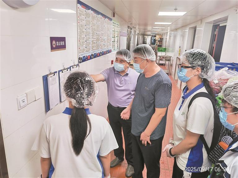 深圳高级中学高中园文博高中学生膳食委员会正在检查食堂食材。