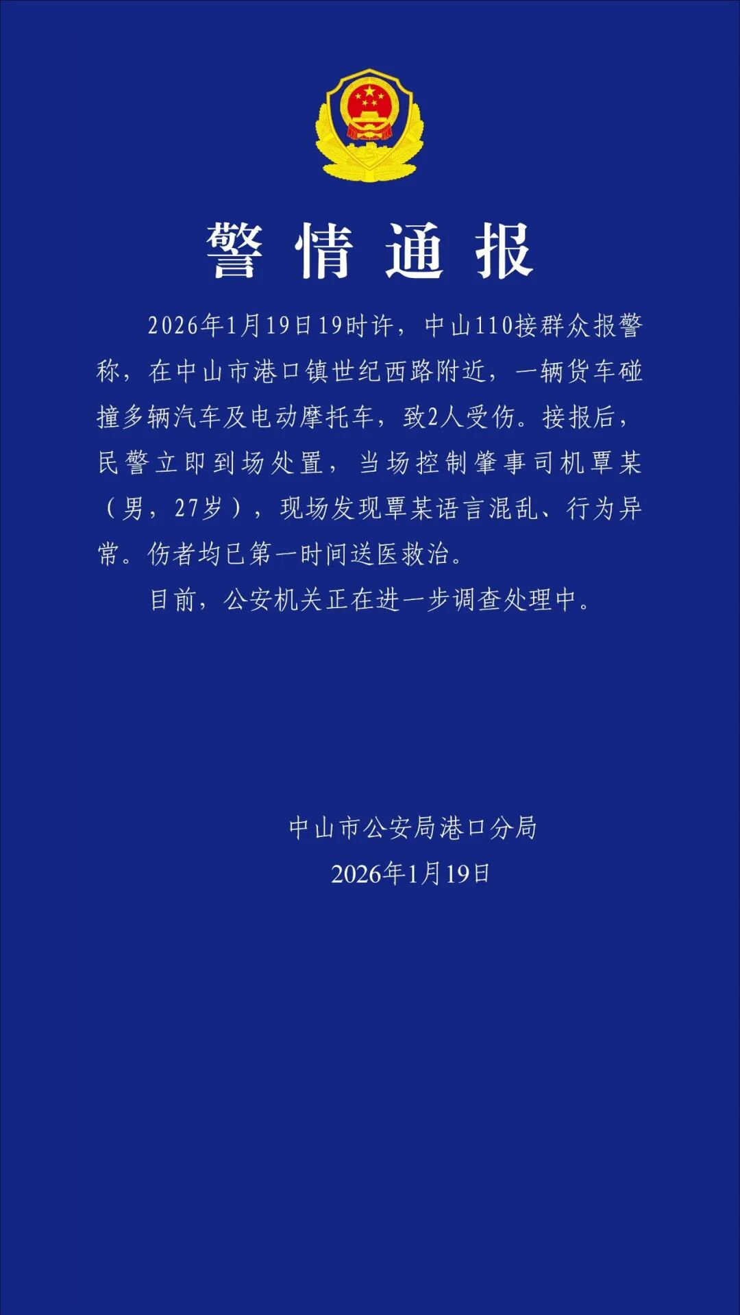 2026年1月19日19时许,中山110接群众报警称,在中山市港口镇世纪西路附近,一辆货车碰撞多辆汽车及电动摩托车,致2人受伤。接报后,民警立即到场处置,当场控制肇事司机覃某(男,27岁),现场发现覃某语言混乱、行为异常。伤者均已第一时间送医救治。