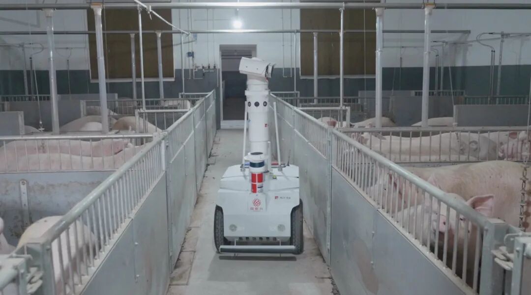 一个瞪着两只大眼睛的移动5G机器人,走在猪圈中间,对着猪圈的二师兄来回扫描,猪的体温、猪圈温度等数据都在后方的大屏上实时显现。二师兄显然对这个长着大眼睛的“新伙伴”很好奇,不时趴到栏杆上,用猪鼻子对着机器人嗅来嗅去,一边发出“啰啰”的猪叫声。