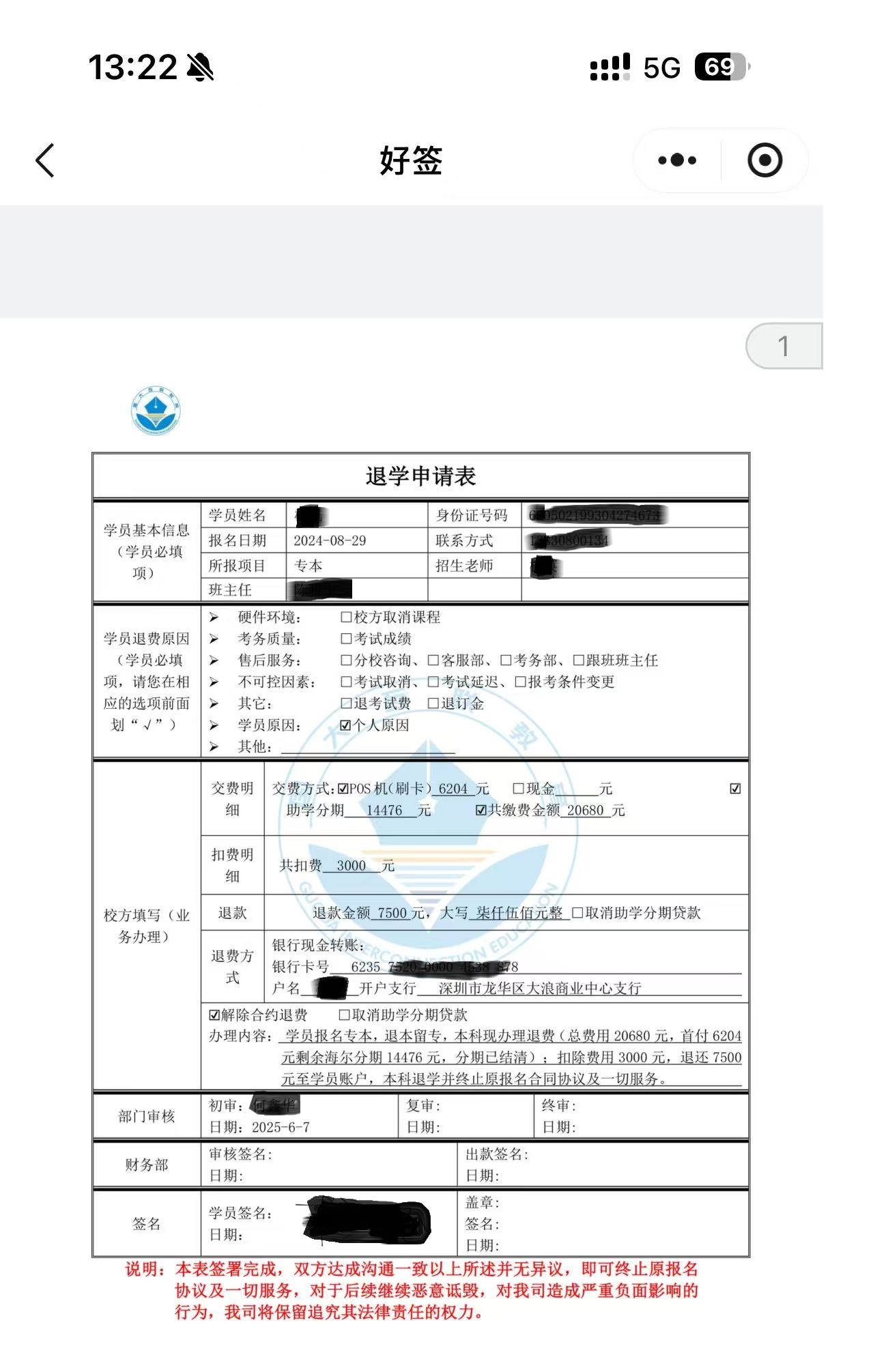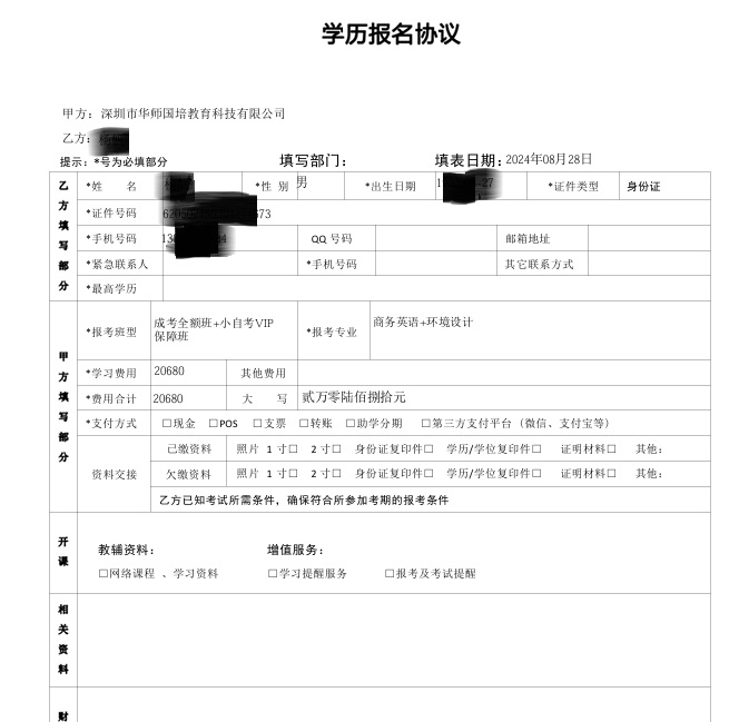 据阿涵提供的相关合同和缴费记录,他是2024年8月28日签的学历报名协议,学习总费用为20680元,贷款金额为14476元,已分三期缴完,收款账户为深圳市华师国培教育科技有限公司(以下简称华师国培)。