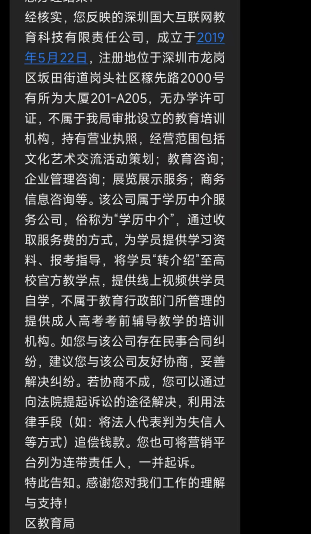 据投诉学员的截图,学员曾将国大教育违约欠费一事向龙岗区教育局反映,该局核查后回复:国大教育无办学许可证,不属于教育局审批设立的教育培训机构,而属于学历中介服务公司(俗称“学历中介”),通过收取服务费的方式,为学员提供学习资料、报考指导,将学员“转介绍”至高校官方教学点,提供线上视频供学员自学,不属于教育行政部门所管理的提供成人高考前辅导教学的培训机构。如与该公司存在民事合同纠纷,建议与其协商,若协商不成,可通过向法院起诉解决,利用法律手段(如将法定代表人判为失信人等方式)追偿钱款,也可将营销平台列为连带责任人,一并起诉。