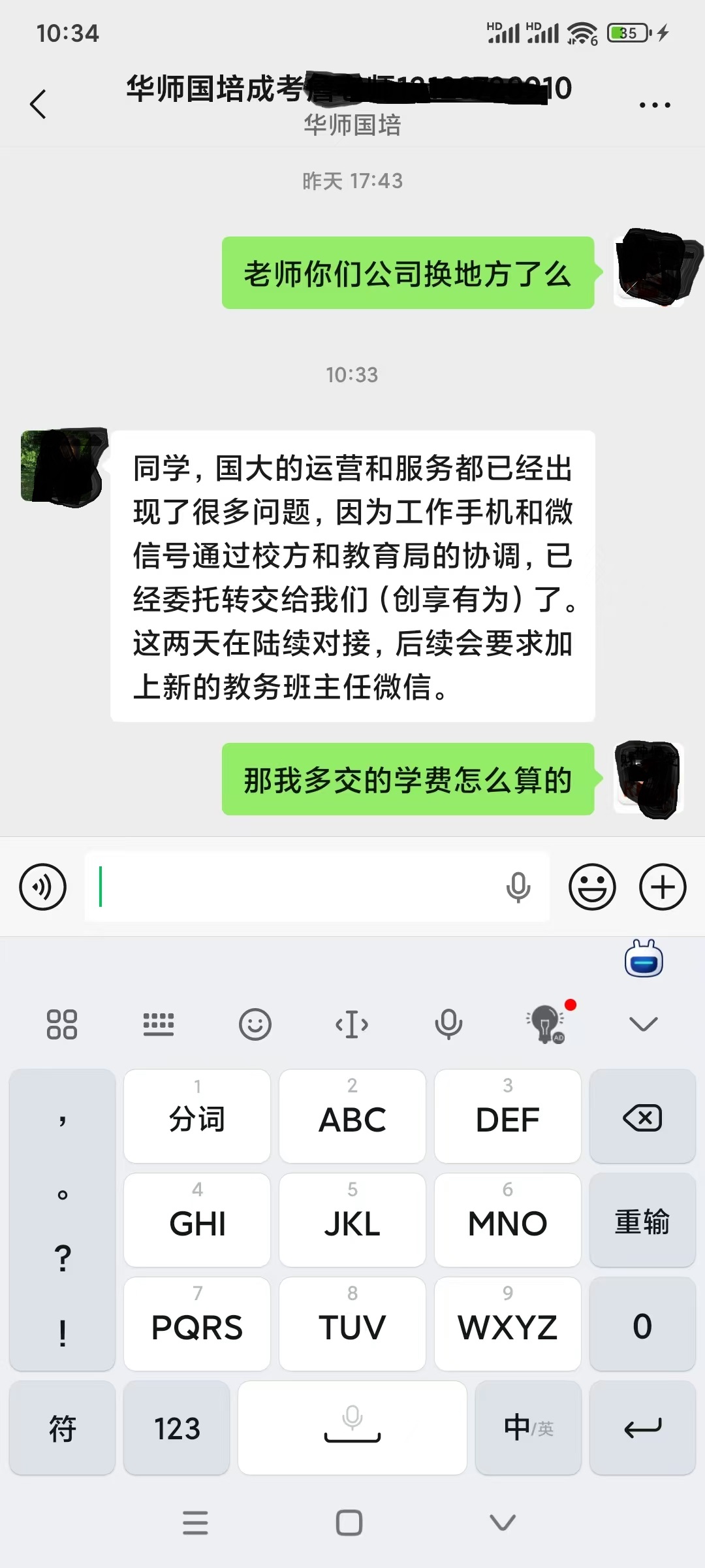 通过阿涵,记者联系上了多位追讨退费的学员。有两位是一次性交了报名费9800元但没报上名没退费的,其中一位追讨过一次,只退了第一年的学费2736元,另一位一分未退。“是国大教育的老师叫扫华师伴学的收款码,支付了学费和论文指导费到华师伴学的收款账户。”