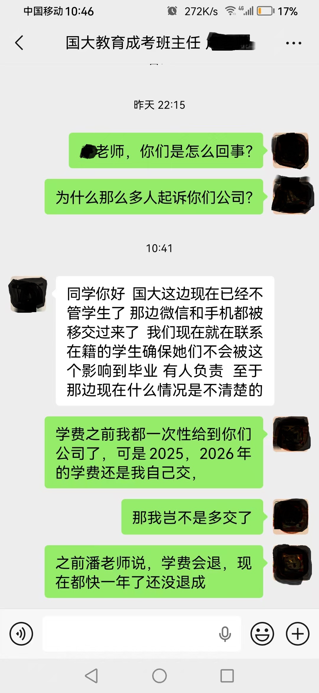 1月21日,另一位受访学员阿京(化名)说,今年是她报名国大教育学习的最后一年,“我报的学校是20号截止交学费,前段时间我一直在催负责我的那个老师”,但国大教育直到1月20日过了,一直没有向她报考的学校交费,也没有退还她此前交的费用。