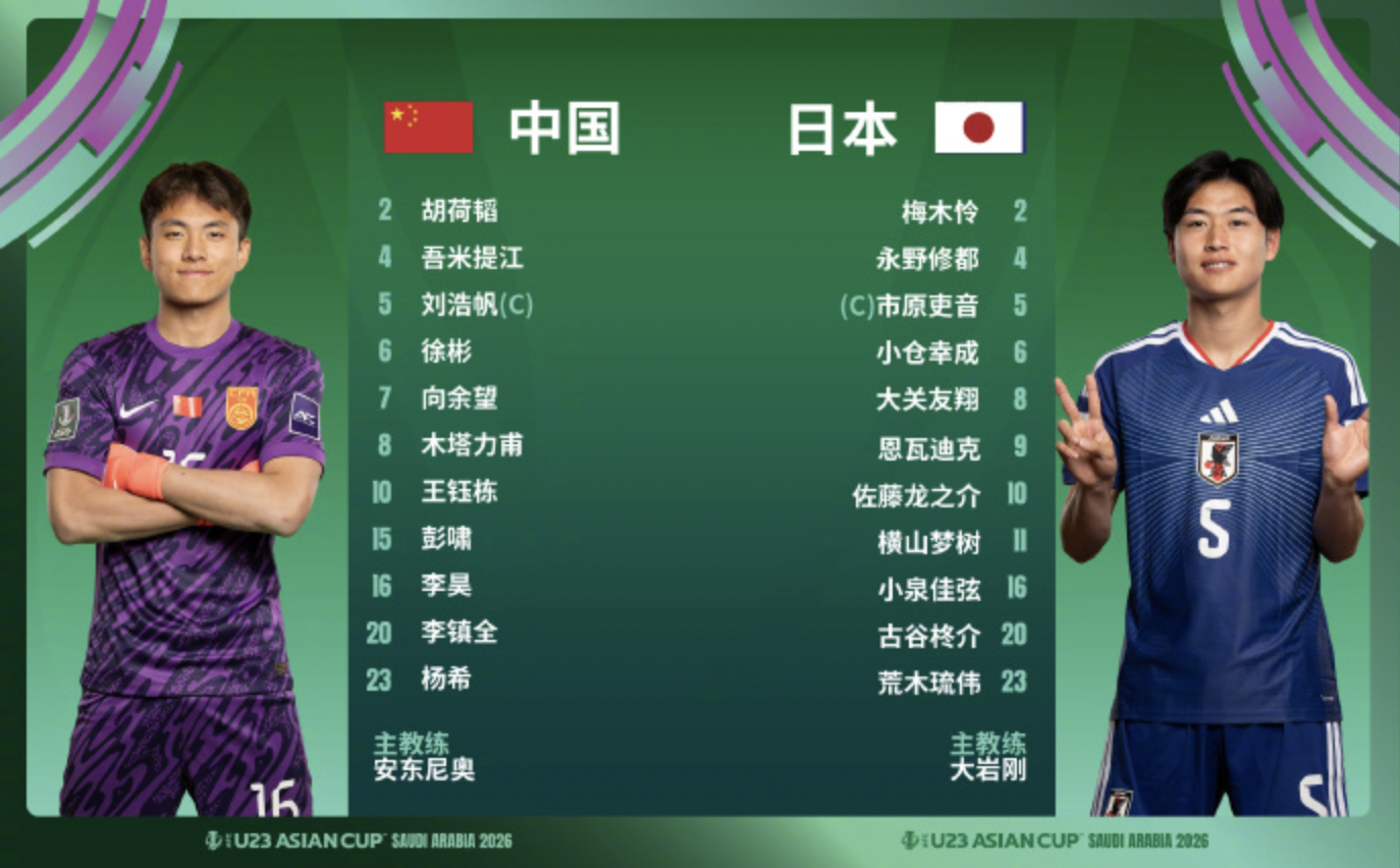 北京时间1月24日23点,U23亚洲杯决赛,中国男足U23vs日本U23,本场比赛首发出炉。