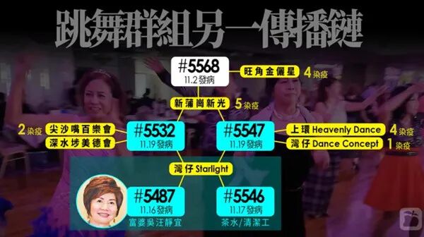 该名61岁妇人昨日确诊,距离她发病日期足足拖了20日,她发病后到过新蒲岗越秀广场新光宴会厅及旺角金俪星凤凰于飞怀旧歌舞(金丽会);除她以外,两个舞场先后有9人染疫,该9人中又有人去过其他爆疫舞场,当中一男一女再去湾仔Starlight Dance Club等5间舞厅,再多7人中招,包括尖沙咀百乐会怀旧歌舞、湾仔Starlight Dance Club、深水埗美德会、上环Heavenly Dance、湾仔Dance Concept,继而造成群组大爆发,至今牵连至少14间舞场,怀疑病毒由此「1传16人」、毒延6间舞厅,再辐射式扩散。