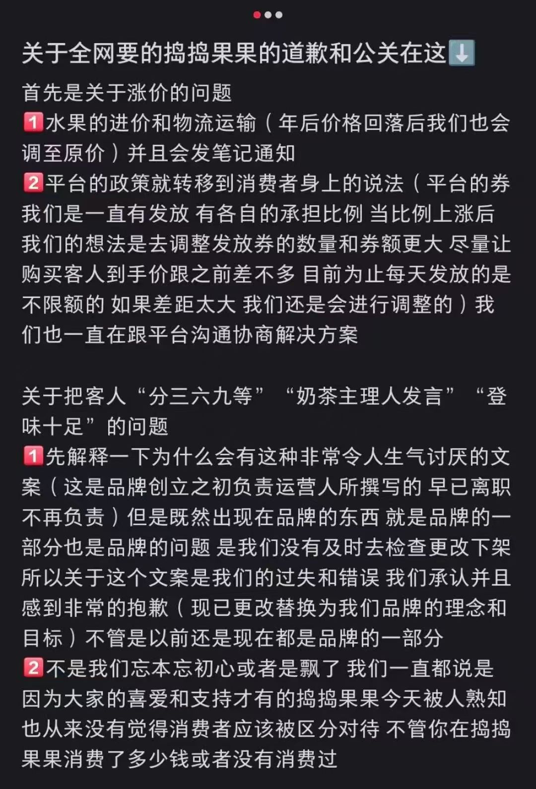 舆论发酵了,品牌总会有个回应。捣捣果果将问题归咎于“离职员工”,这种话术已难服众。小程序上的公开展示,必须经过审核流转,如企业管理层没层层审核,那是工作不严谨;如审核,则是品牌价值观有问题,品牌方怎么都有责任。但细读捣捣果果的道歉说明,在出事后第一时间推诿给离职员工,回避根本反思,甚至悄然删除致歉内容,更显其危机应对的仓促与诚意匮乏。