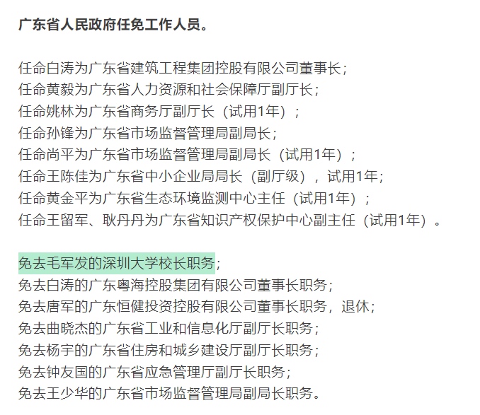 2月6日,广东省人民政府任免工作人员通知显示,中国科学院院士毛军发已不再担任深圳大学校长。