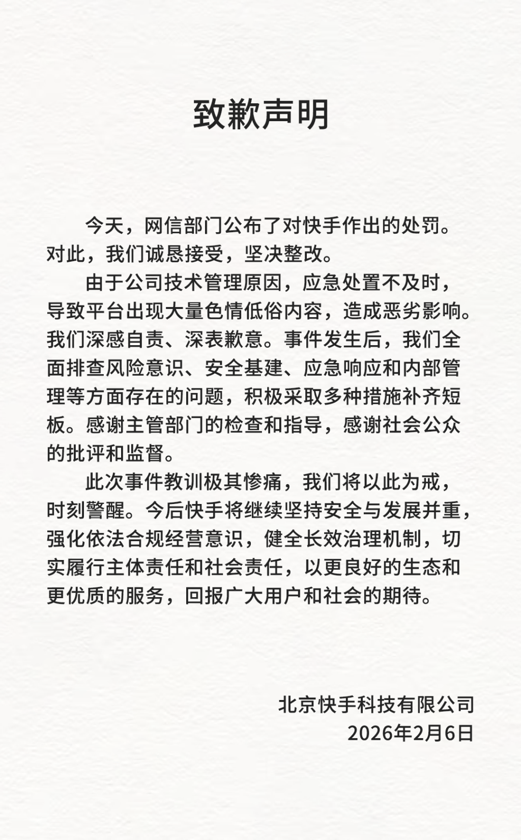 据“快手”微信公众号2月6日消息,快手方面对网信部门作出的处罚表示诚恳接受,坚决整改。全文如下: