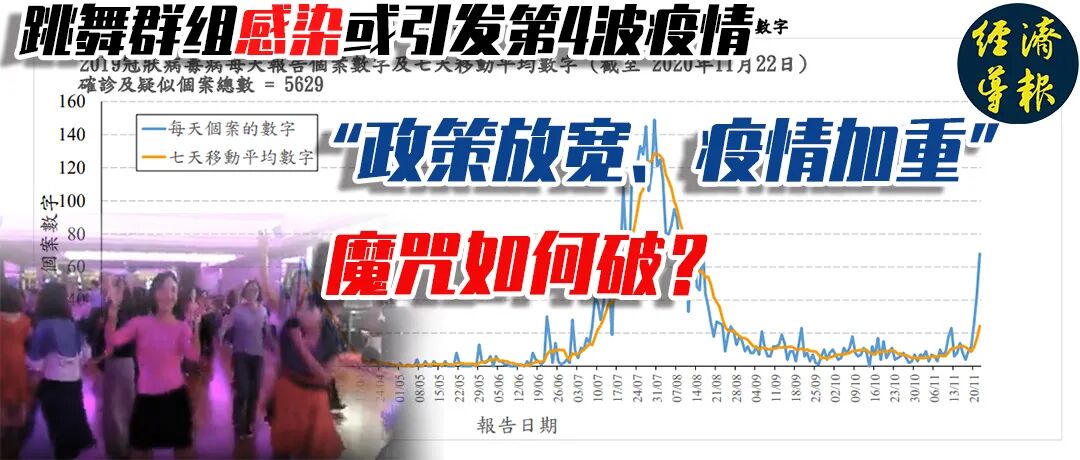 在近期确诊的病例中,“Starlight dance club跳舞群组”占相当大一部分比例。11月21日新增个案中,就有21人属于此群组,22日又有46确诊案例与此群组有关。该群组中,多人是跳舞老师,在确诊之前曾去过共计14个跳舞场地,而且群组已出现二代传播,即已经传播给家人等密切接触者。
