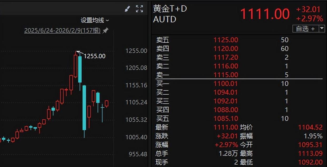 近期,黄金市场呈现波动状态。东方财富网显示,黄金T+D最新价为1111元/克,较前一交易日上涨32.01元,涨幅达2.97%。但相较近期1255元/克的高点,跌去了11.47%;国内期货市场中,沪金主连最新价为1114.5元/克,相较近期1258.72元/克的高点,跌去了11.46%。