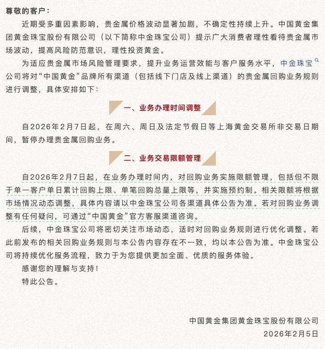 中国黄金公告显示,自2026年2月7日起,在业务办理时间内,对回购业务实施限额管理,包括但不限于单一客户单日累计回购上限、单笔回购总量上限等,并实施预约制。相关限额将根据市场情况动态调整,具体内容以公司各渠道具体公告为准。