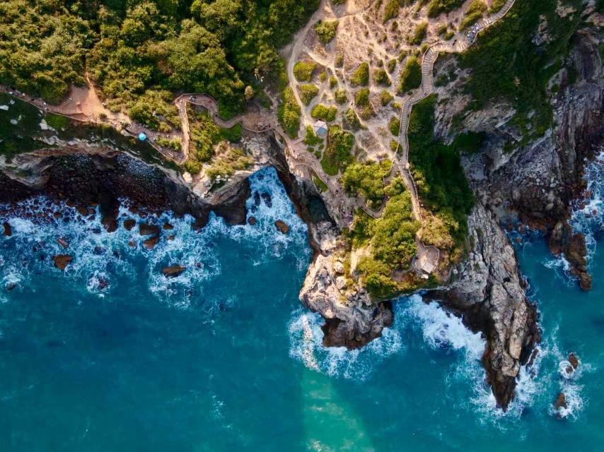 这条建在悬崖上的木质栈道,蜿蜒于嶙峋礁石与蔚蓝海水之间,轻松惬意又美不胜收。站在栈道上俯瞰,海浪拍打礁石的景象尤为壮观。