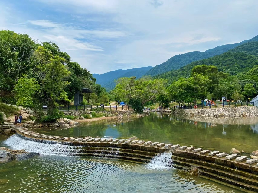 源自大鹏山的纯净泉水,汇聚成清可见底的溪潭,蜿蜒成趣的溯溪路线穿行其间。绿荫蔽日,小鱼嬉游,偶有蝴蝶与飞鸟掠过,平添几分野趣。