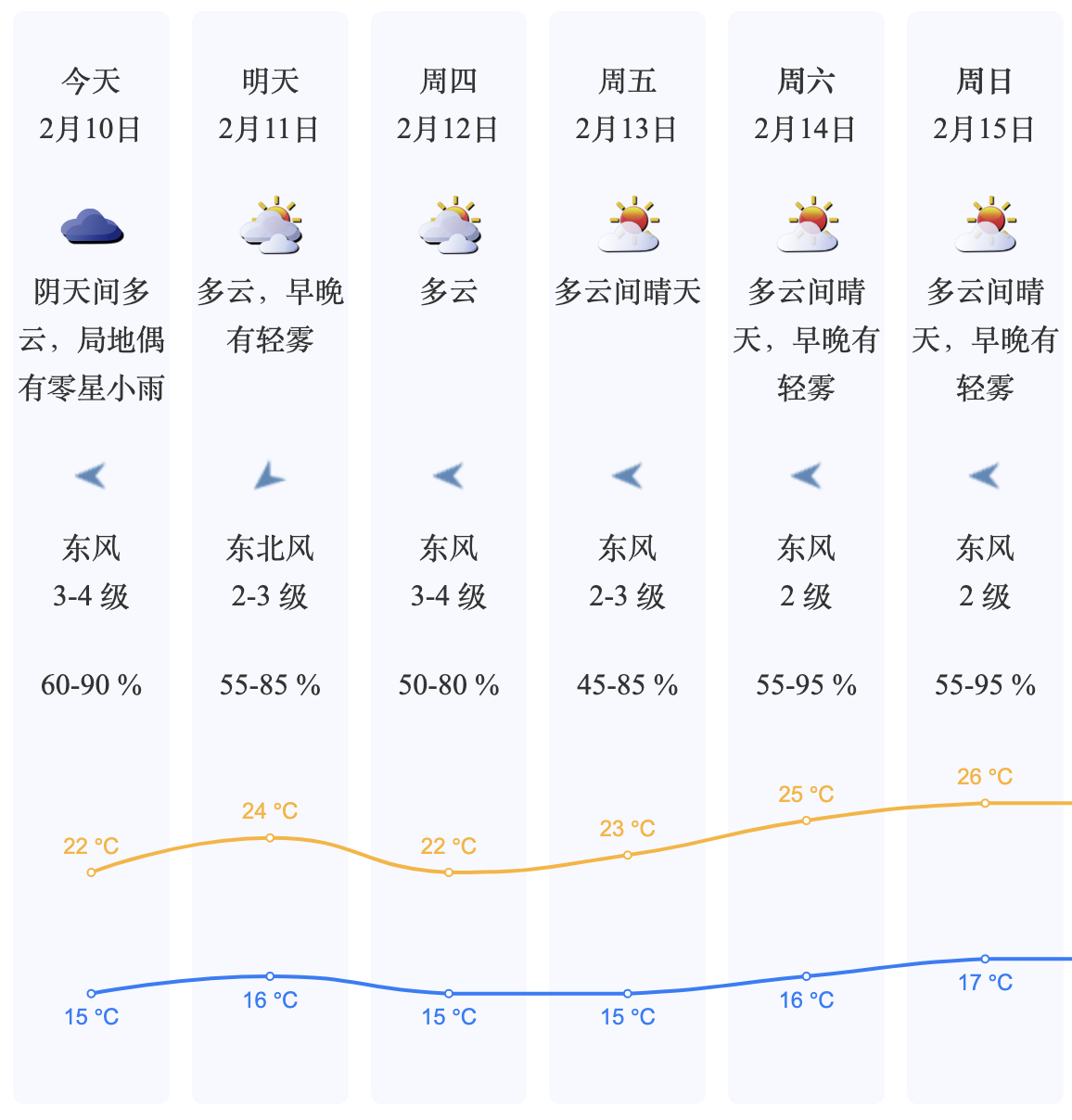 今天(2月10日),深圳将以阴天间多云为主,早晚时段会有轻雾缭绕,局部地区甚至偶有零星小雨“客串”。这种能见度较低的天气,对早高峰出行有一定影响,大家驾车务必控制车速。