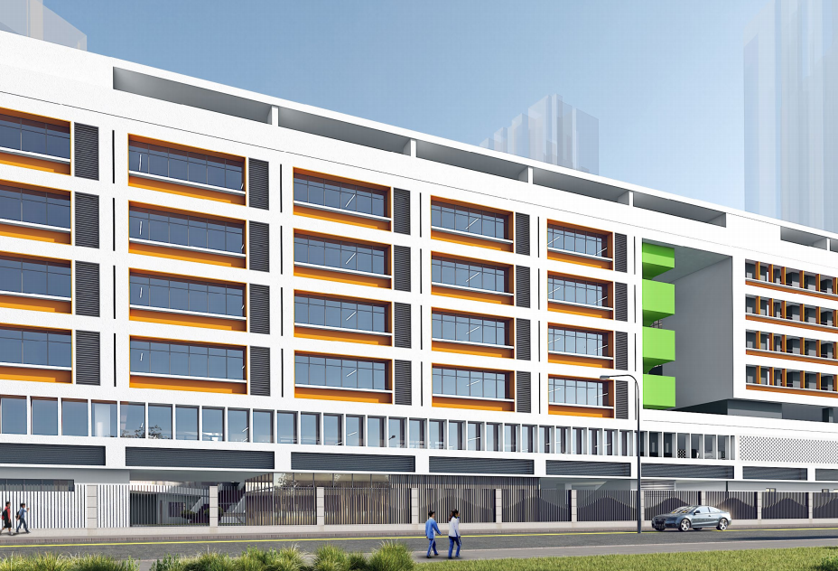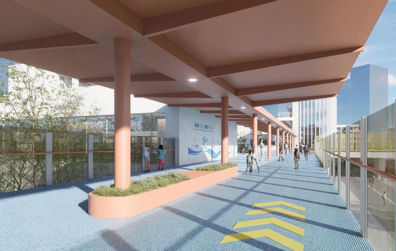 华南物流园配套学校以“立体园林+立体街区”为设计理念,将西侧城市绿地引入校园内部,构建建筑与自然对话、空间与生态交融的趣味庭院。通过空中连廊有机串联各教学单元,形成多层次、互联通的校园慢行系统,底层架空与庭院连廊相辅相成,既提供全天候活动场所,亦形成良好的自然通风体系。项目采用中小学分地块建设模式,教学区独立且交通有机串联,既有专属教学设施,也有共享共用空间,功能分区明确且联系紧密。景观设计融入岭南特色与中小学生行为特征,以现代手法转译传统建筑意向,同时兼顾家长接送与街区共享需求,打造向社区开放的友好型校园。