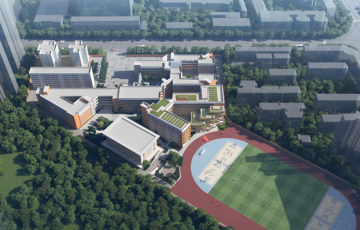 新华中学新建教学楼则创新采用“层叠式”垂直空间设计,在仅5860平方米的“插缝地”上实现功能高效布局:地下及低楼层置入大跨度剧场与体育场馆,中层设置标准教学区,顶层打造屋顶生态教学基地,将原本的闲置绿地转变为高产出的“教学矩阵”。交通设计上,空中连廊实现新旧校区无缝无障碍衔接,景观大阶梯高效衔接田径场与内部功能区,既打破物理隔阂、缩短转场距离,更打造出大量遮阳避雨的半户外交流走廊。校园景观以“形象主轴”与“景观次轴”串联行政、教学与运动区,“花园讲堂”“曲桥景亭”“假山叠泉”等景观节点,为高密度校园注入诗意与呼吸感,而立面色彩沿用老校区素雅色调,实现新旧建筑的“血脉相连”。