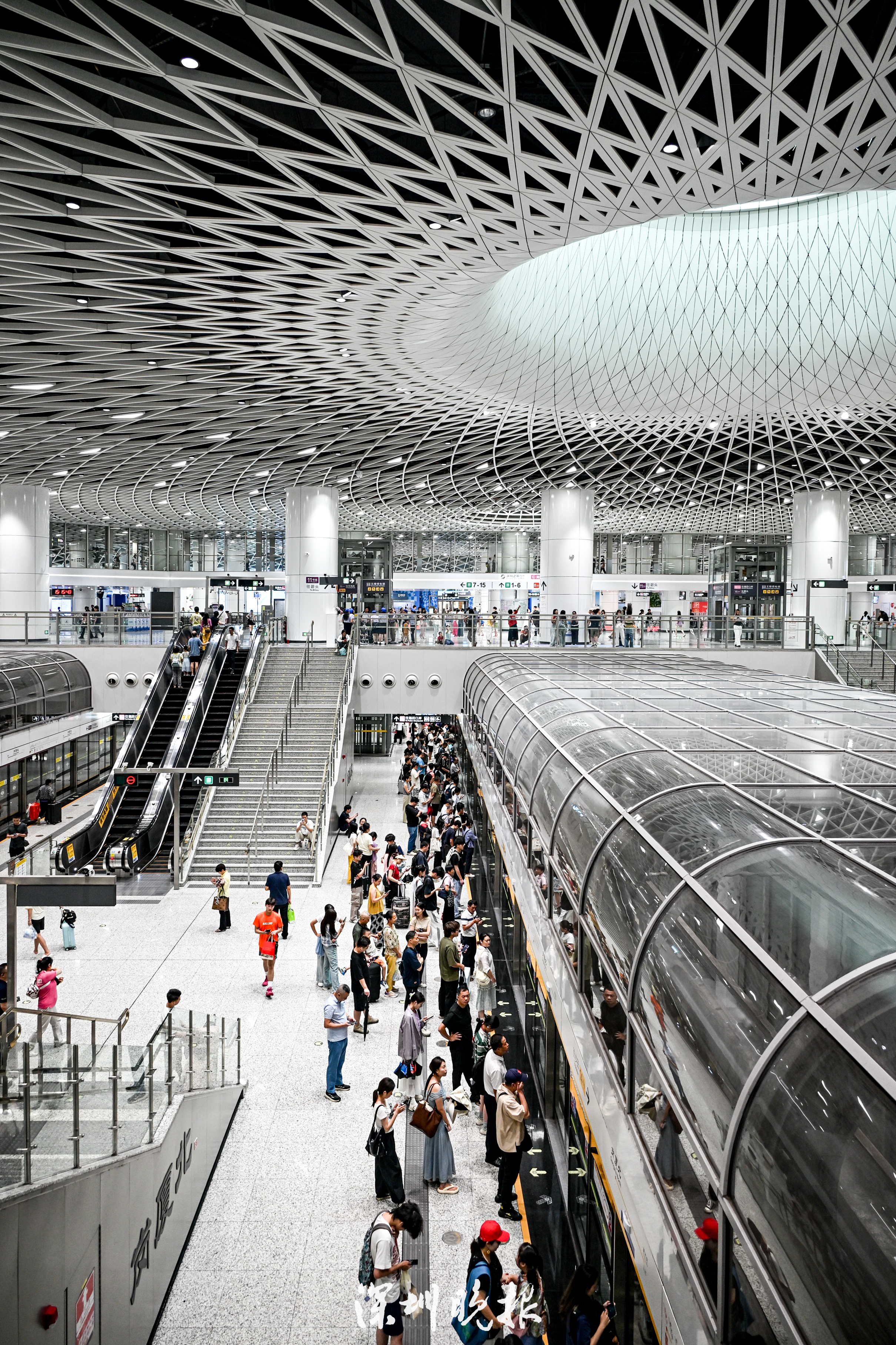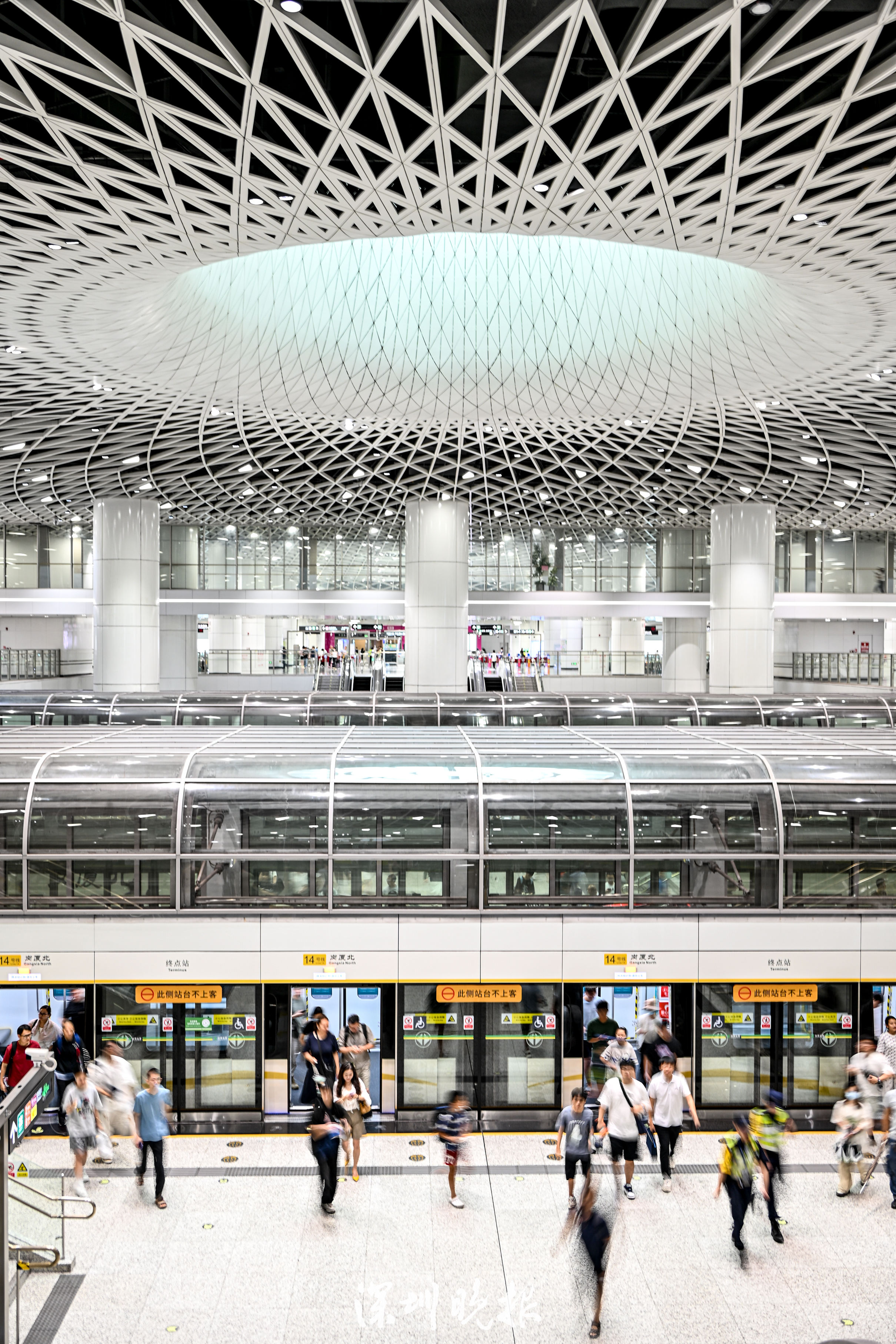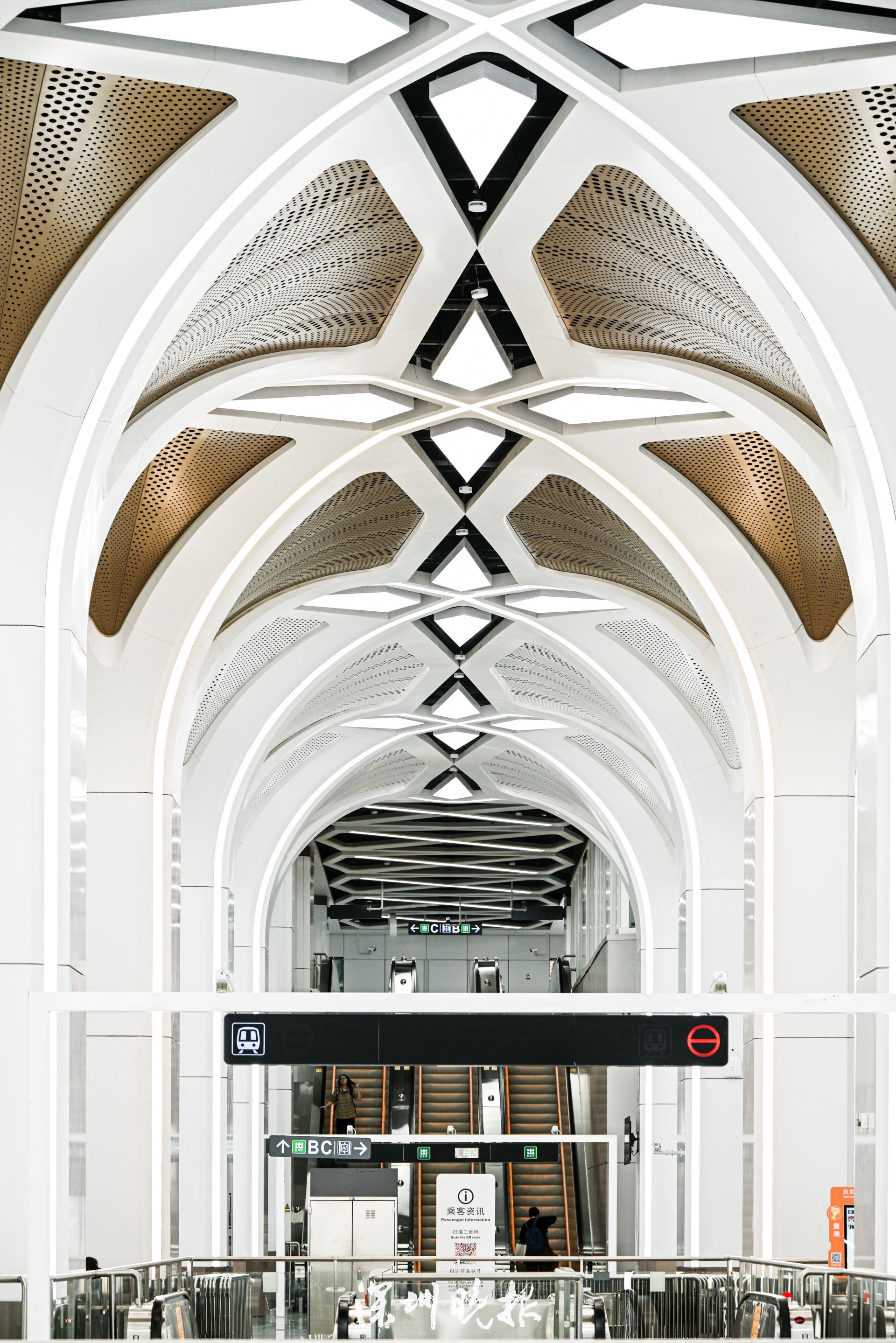 坐地铁逛深圳,如同一场科技漫游。岗厦北地铁站作为电影《惊蛰无声》的取景地,凭借“深圳之眼”成为网红打卡点,费马螺线交织的穹顶极具冲击力。
