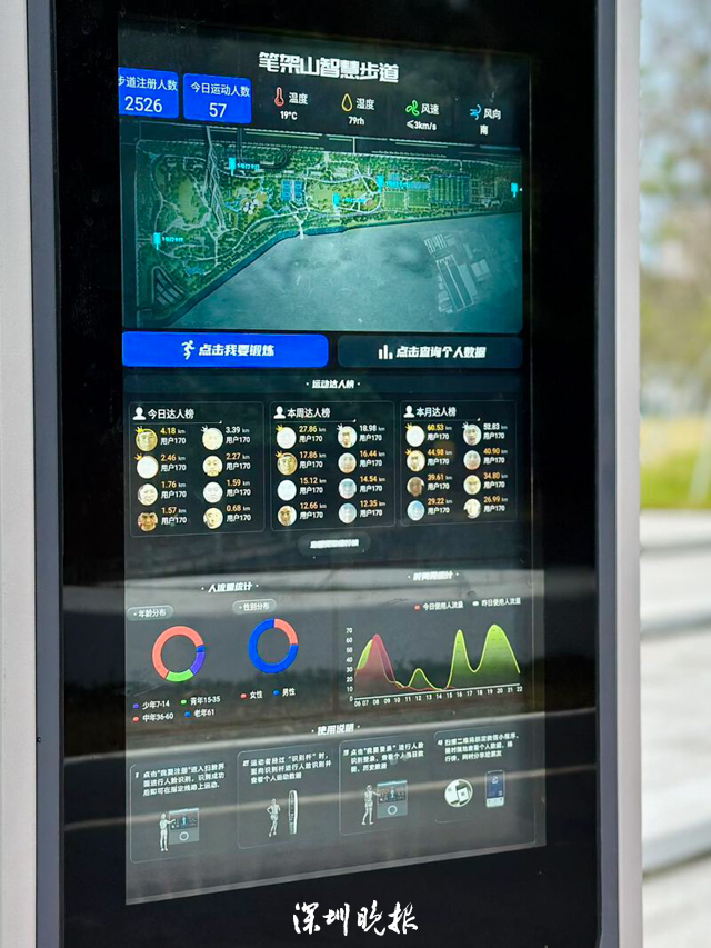 智能健身场景已然融入日常。在笔架山体育公园,智慧交互大屏轻点就能调出公园全域地图,实现查交通、查天气、语音导览功能。