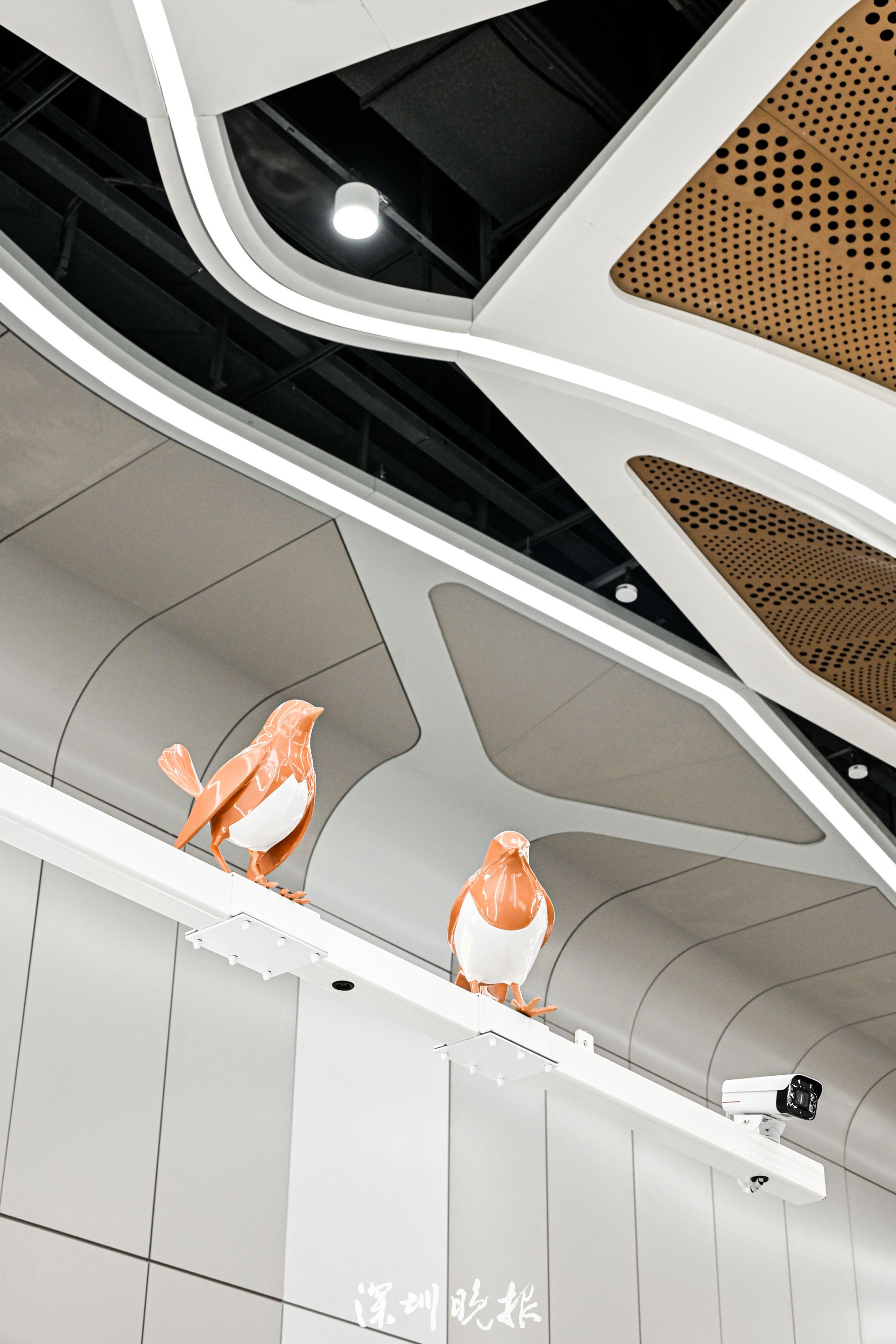 石鼓站以无人机为灵感,弧形穹顶如展开的羽翼,几何灯带搭配鸟儿雕塑,让地下空间也满是“飞翔”的轻盈。