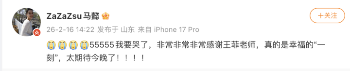 今天下午,马懿更是在个人微博上留言说自己要哭了,“非常非常非常感谢王菲老师,真的是幸福的‘一刻’,太期待今晚了!!!!”