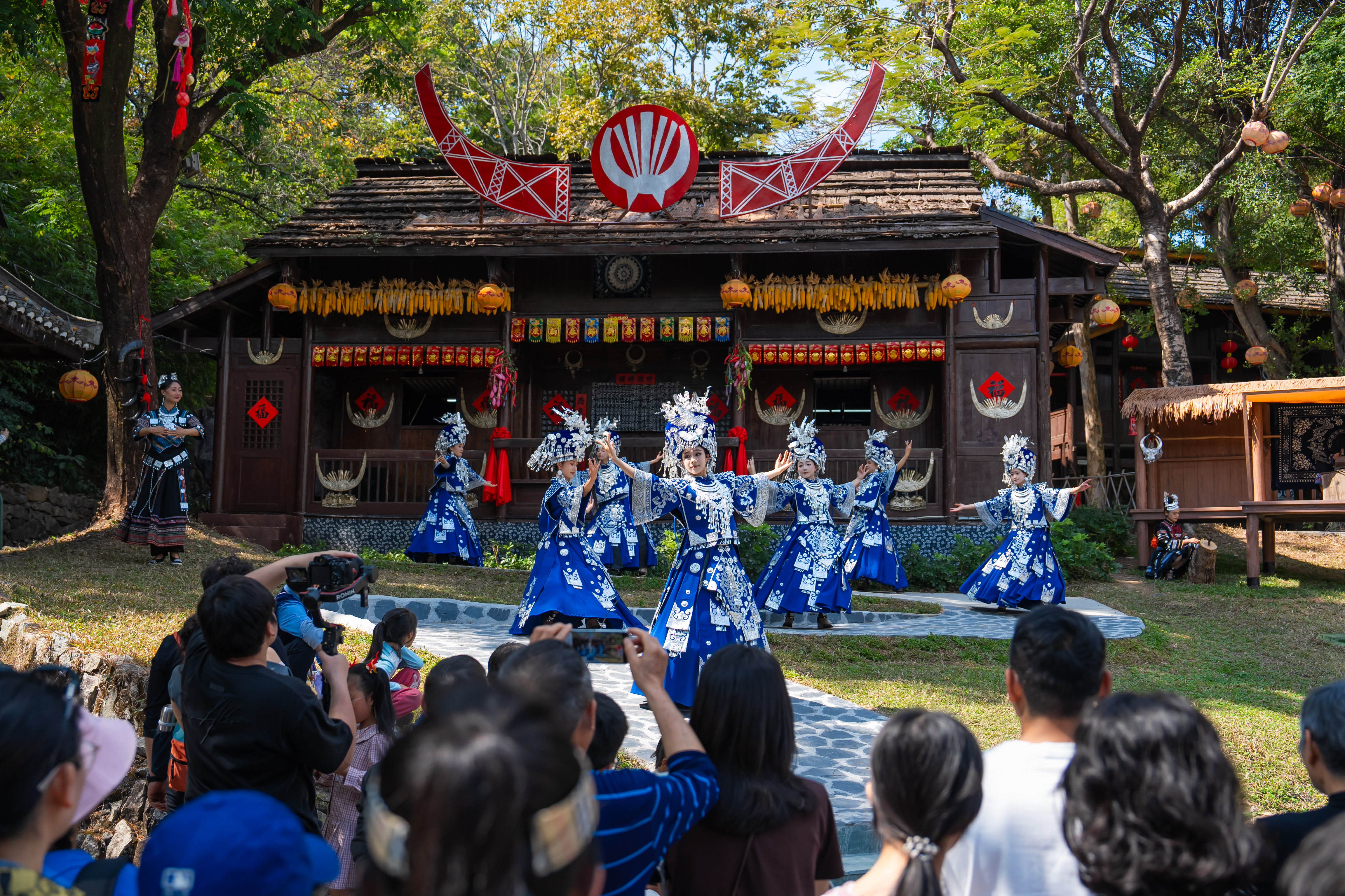 白天的民俗村内更是精彩纷呈,《金银鸟》《舞脉相承》《扎西德勒秀》等七大全新精品演艺,以及《上刀山》《纳兹库姆》《木鼓欢歌》等特色非遗民俗演艺全天候轮番上演,不同时段、不同村寨皆有精彩演艺,让游客漫步锦绣中华的每一处,都能感受到最纯正、最浓郁的民俗年味。