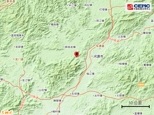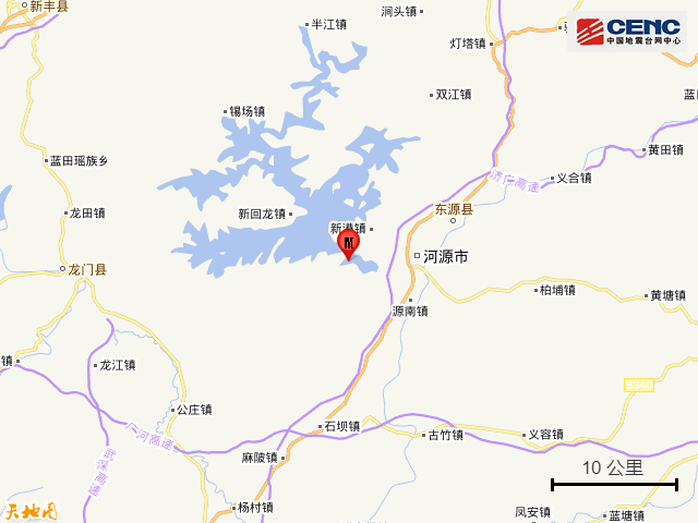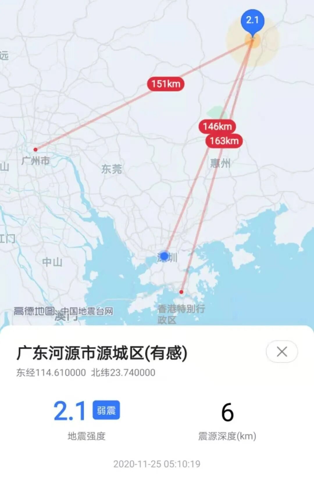 此次河源地震震中距离广州151公里