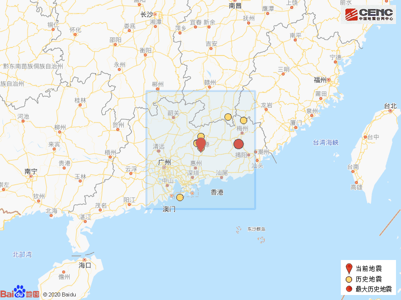 历史地震:根据中国地震台网速报目录,震中周边200公里内近5年来发生3级以上地震共9次,最大地震是2020年1月20日在广东梅州市兴宁市发生的3.7级地震(距离本次震中143公里),历史地震分布如图。