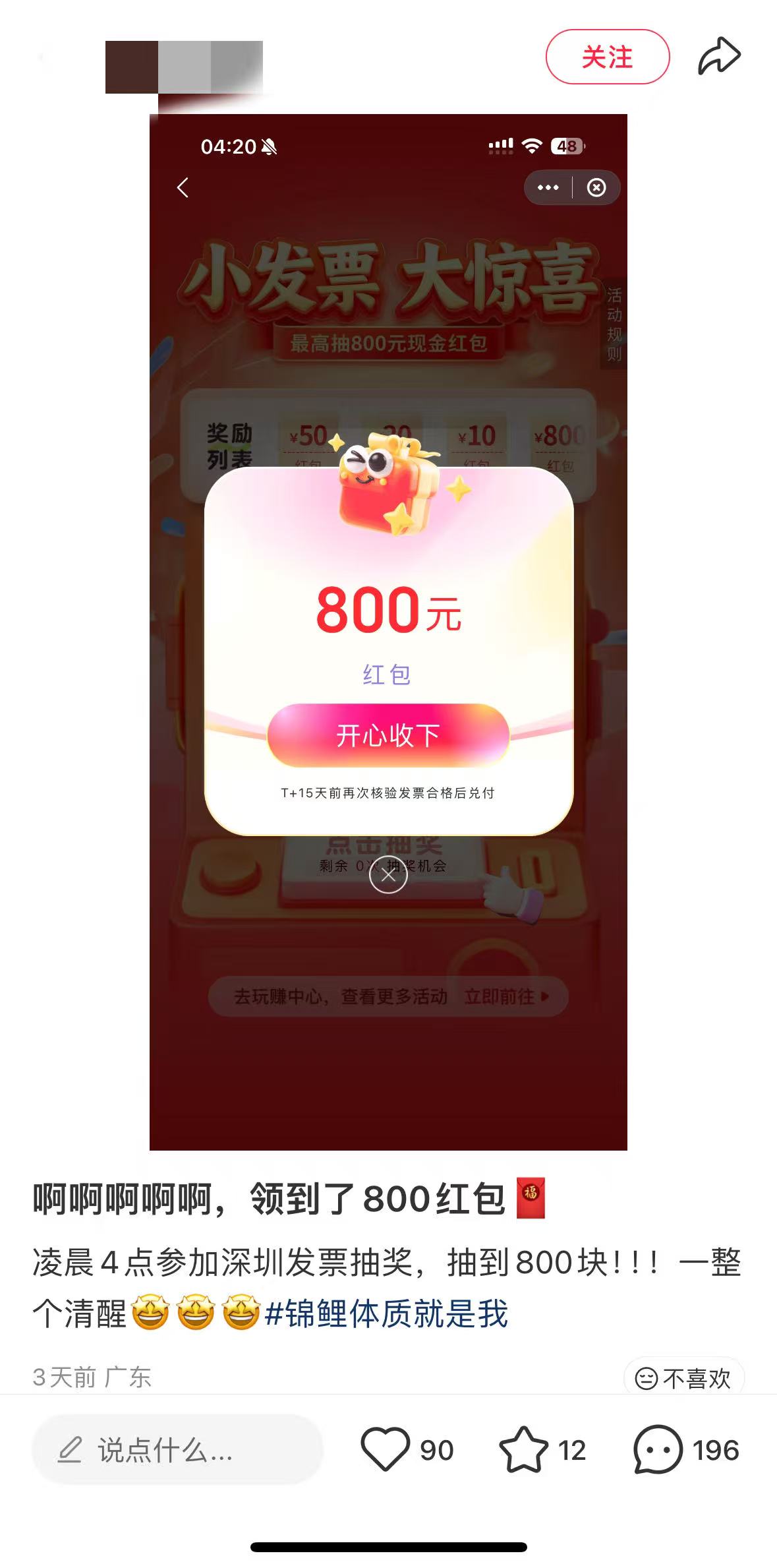 记者在社交平台上发现,近期有许多网友发布了有关发票抽奖的内容。有人晒自己中了最大额度的奖金800元,有人分享线上消费平台开发票的方法,有人整理了可以开发票参与活动的商家名单等,还有深圳的网友特别提醒,深圳地区新开具的发票最好等30分钟再上传,否则容易出现错误遭拒绝,发票通过审核的当天必须完成抽奖。