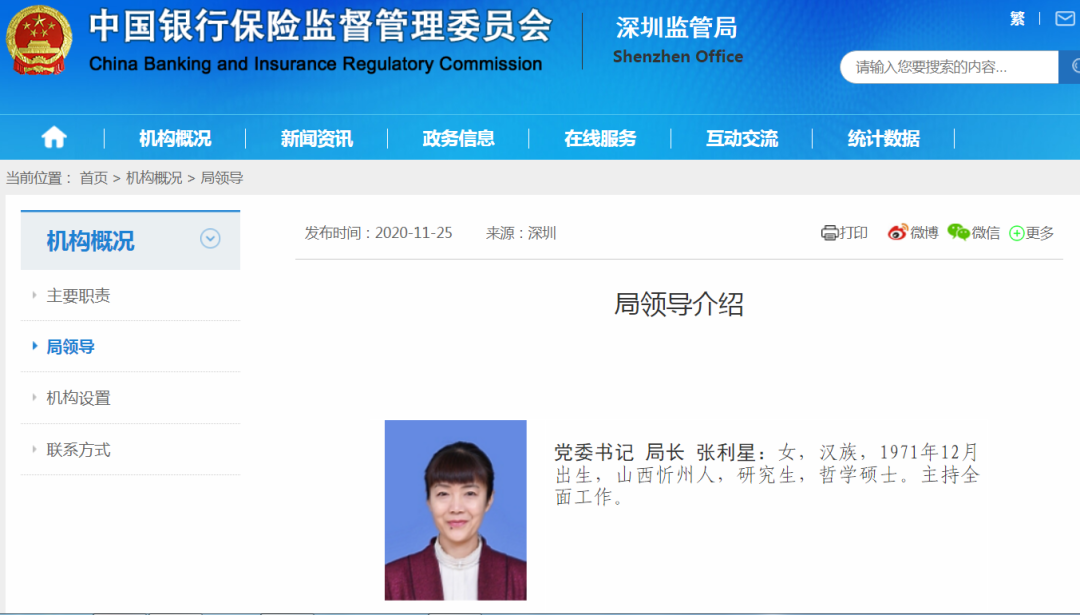 11月25日,深圳银保监局官网更新了局领导信息,大连银保监局原局长张利星已出任深圳银保监局党委书记、局长,主持全面工作。