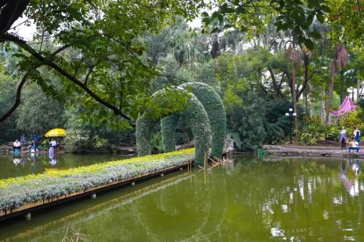 杜鹃园的菊花品种和盆景精品园历来颇受市民游客的喜爱,本届花展中,该展区通过自然的圆竹曲线型布置,形成动感流畅的展示空间,错落布置博古架和品种展示台,勾勒出诗意精美的画卷。钓鱼区则布置粉色菊花拱门和花桥,配以水面的花卉浮岛及岸上的菊花水榭,烘托出浓厚的浪漫风情,预计将成为本届花展的打卡点之一。