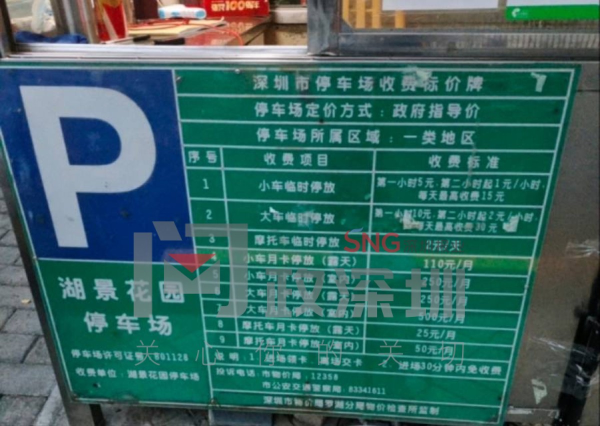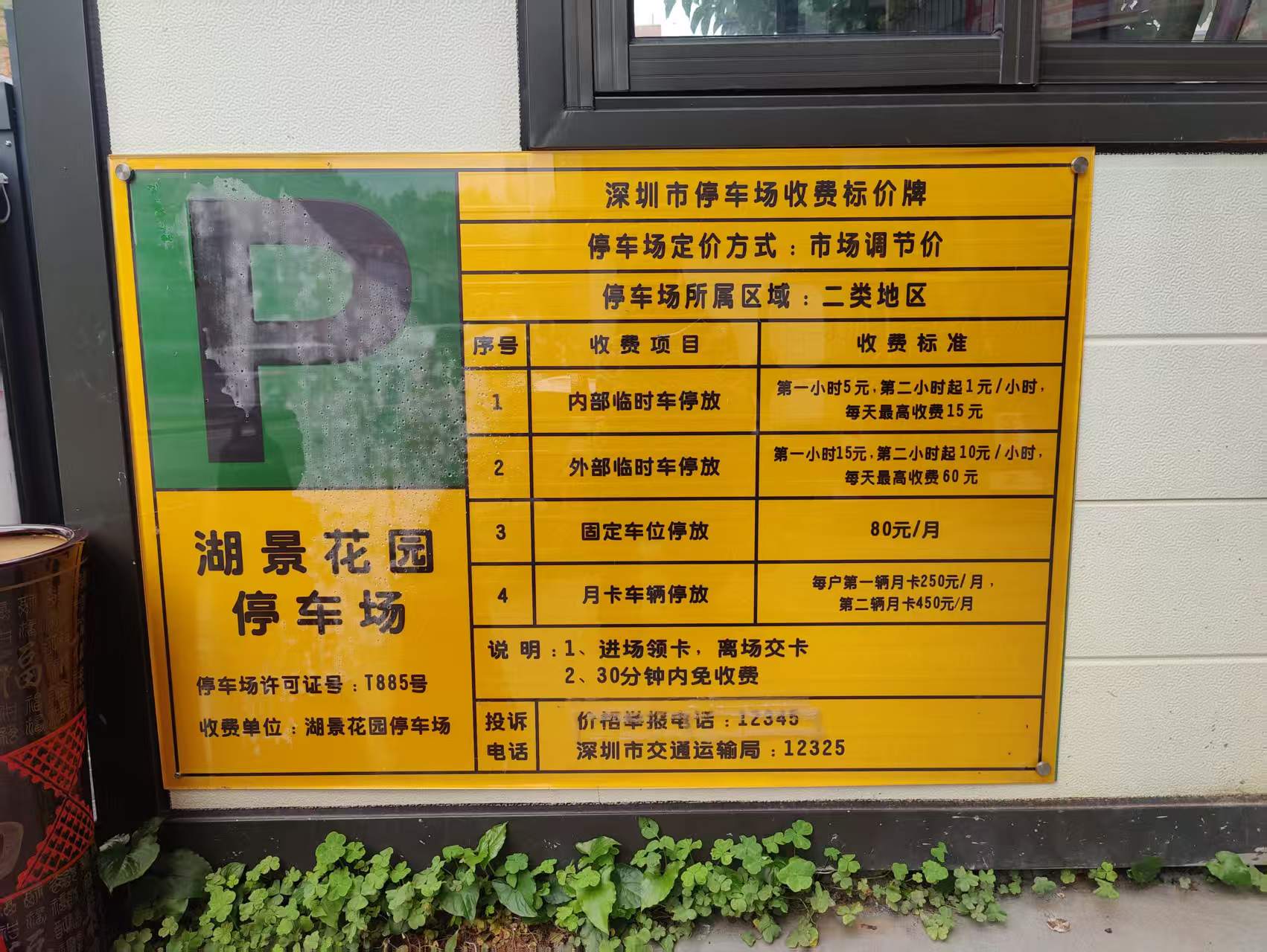 4月6日,深圳特区报&读特记者前往湖景花园现场采访。小区门口已经挂上了调整后的停车场收费标价牌,其内容显示,停车场定价方式为市场调节价,所属区域为二类地区。收费项目包括内部临时车停放、外部临时车停放、固定车位停放和月卡车辆停放。其中,内部临时车停放收费标准为第一小时5元,第二小时起1元/小时,每天最高收费15元;外部临时车停放收费标准为第一小时15元,第二小时起10元/小时,每天最高收费60元。
