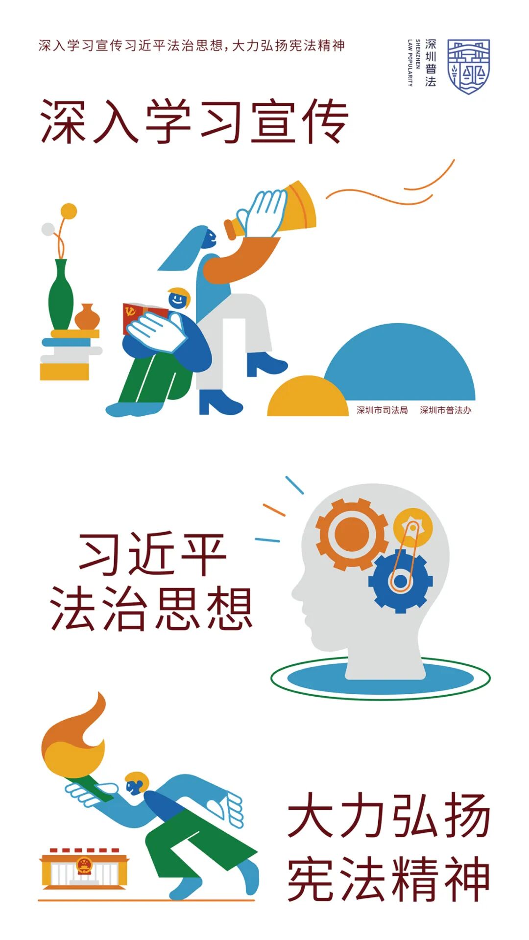 表达了习近平法治思想,并用画面中人物愉悦地学习、宣传宪法知识,以及用火炬手的形象表达宪法精神手手相传,全民参与,精神永续。