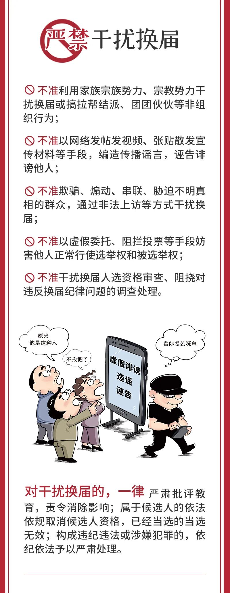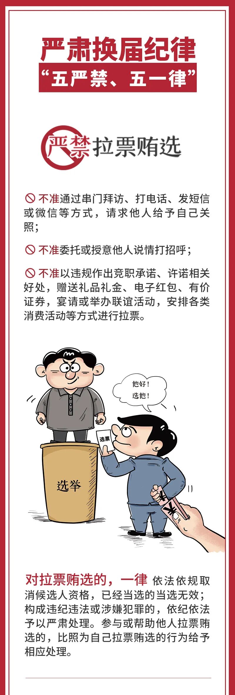 2021年村(社区)“两委”换届是基层组织建设的一件大事、要事。根据我省制定的“五个严禁、五个一律”纪律要求,市换届办制作了宣传长图,让我们严格遵守换届纪律,共同营造风清气正的换届环境。