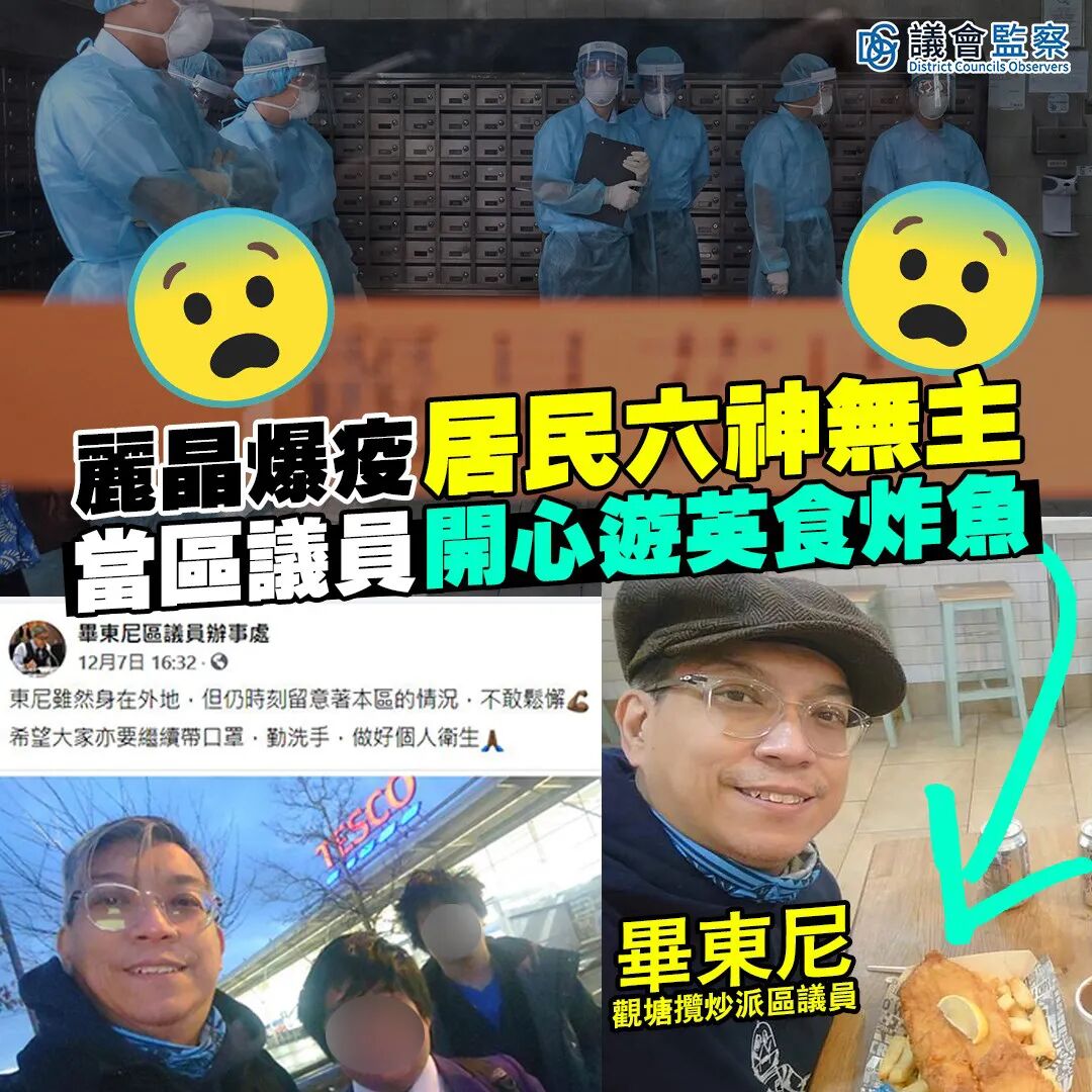 九龙湾丽晶花园疫情大爆发,不少住户紧急撤离,随后更被政府专家称为「疫区」。然而,居民人心惶惶之际,丽晶区议员、公民党区议员毕东尼却在社交网络上大晒英国风景,甚至食炸鱼薯条的相片。