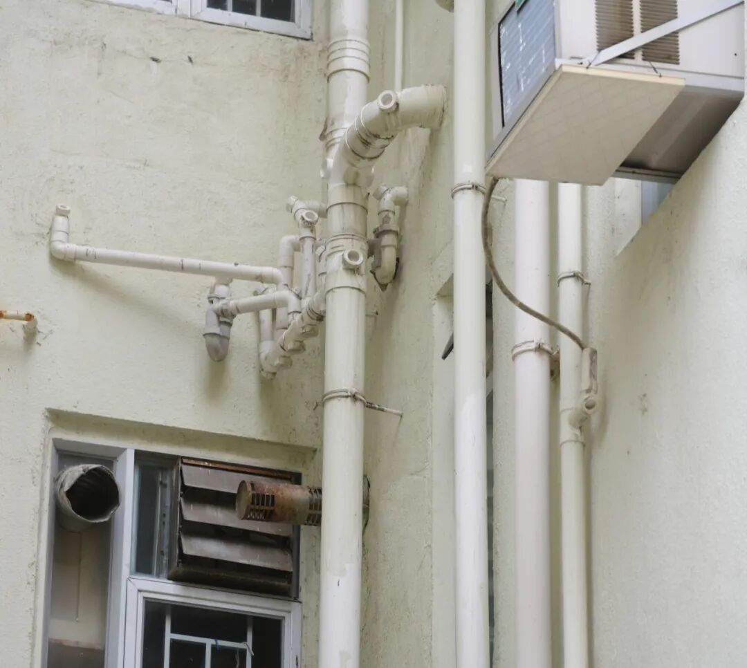 大厦单位外墙污水渠怀疑接驳设计出问题播疫。记者 崔俊良摄