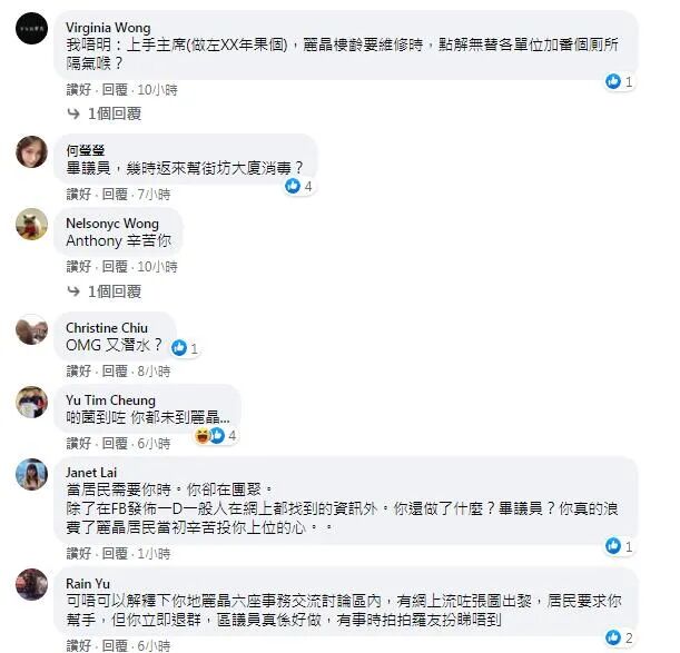 毕东尼声称,“虽然身在外地,但仍时刻留意着本区的情况,不敢松懈”,但却有不少当区居民在其fb页面留言,称“毕议员,几时返来帮街坊大厦消毒?”、“当居民需要你时。你却在团聚”,更有网友暗讽其“深入疫情严重的英国,为大家找寻抗疫良方”。