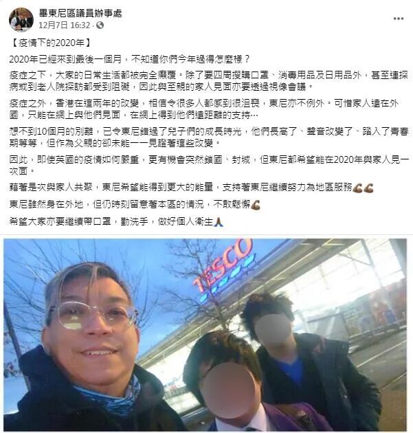 原来,毕东尼声称,“不到10个月的别离,已令东尼错过了儿子们的成长时光”,故“即使英国的疫情如何严重,更有机会突然锁国、封城,但东尼都希望能在2020年与家人见一次面”,因此毕东尼“恰好”于日前前往英国休假。