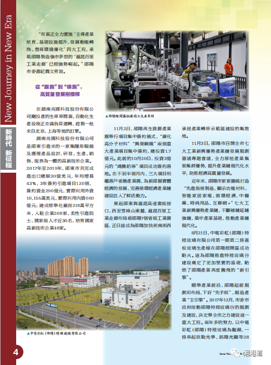 “市里正全力实施‘主导产业培育、基础设施提升、发展动能转换、营商环境优化’四大工程,承载邵阳制造强市梦想的‘沪昆百里工业走廊’已经强势崛起。”邵阳市委书记龚文密说。