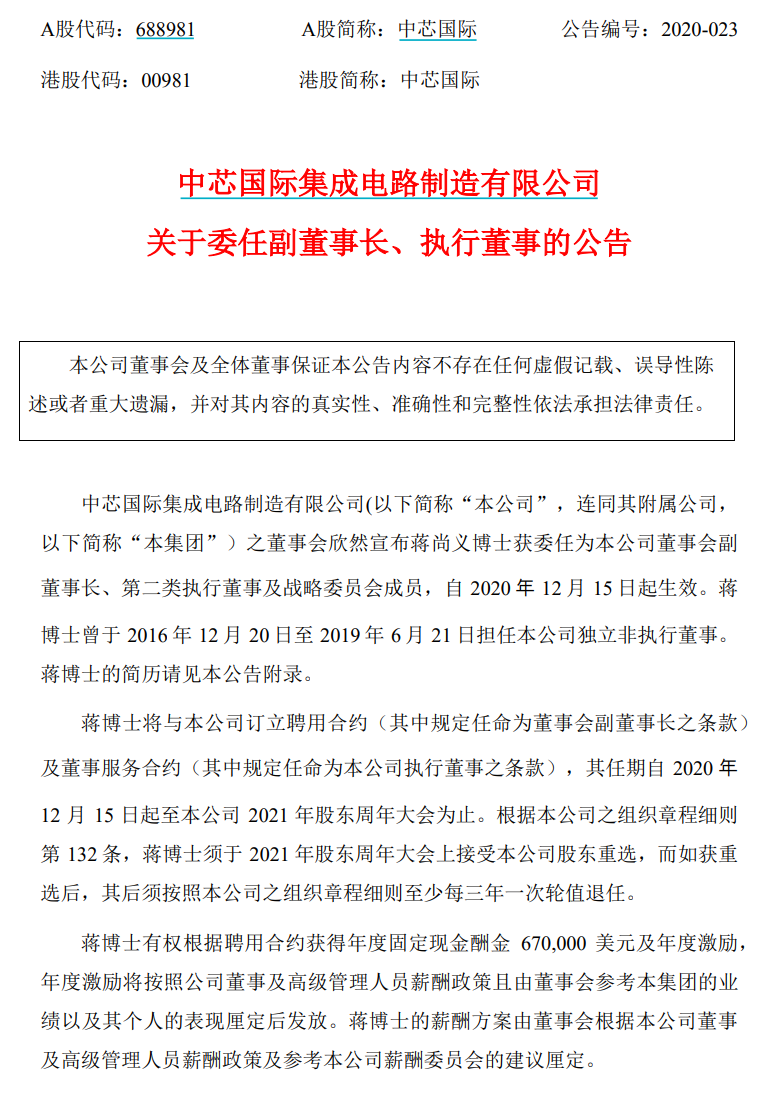 公告宣布,蒋尚义获委任为公司第二类执行董事、董事会副董事长及战略委员会成员,自2020年12月15日起生效。蒋尚义曾于2016年12月20日至2019年6月21日担任公司独立非执行董事。