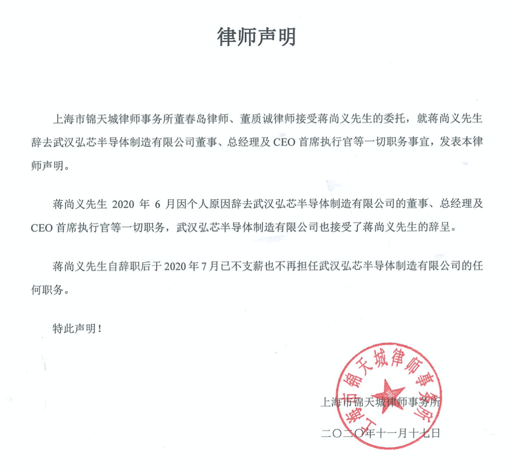对此,蒋尚义选择“急流勇退”。11月17日,蒋尚义通过律师发表声明,称自己于6月份辞去武汉弘芯的董事、总经理及CEO首席执行官等一切职务,自辞职后于7月已不支薪也不再担任武汉弘芯半导体的任何职务。