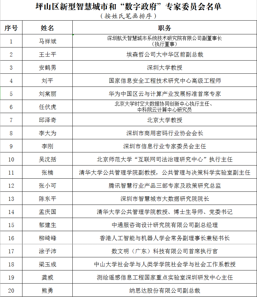 坪山区新型智慧城市和“数字政府”专家委员会于2019年正式成立,由来自智慧城市和“数字政府”建设各专业领域的20名专家学者组成,旨在为智慧坪山建设提供专业的意见建议及方向性指导,提升智慧坪山在项目建设和成果推广等方面的整体水平,助力坪山打造智慧城市示范样板。