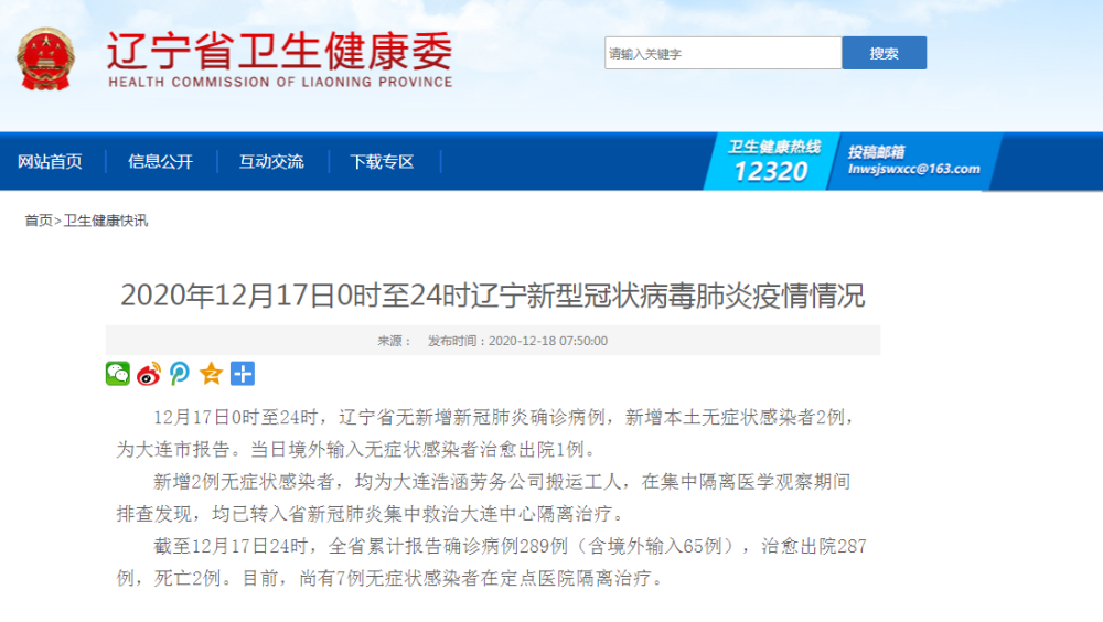 12月17日0时至24时,辽宁省无新增新冠肺炎确诊病例,新增本土无症状感染者2例,为大连市报告