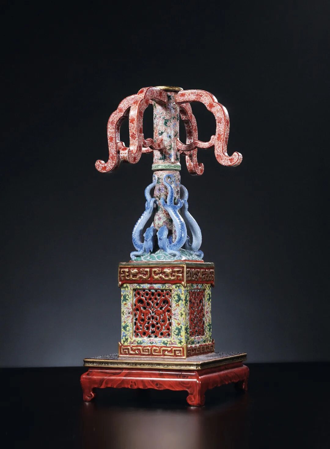 此冠架由独立的三部分组合而成,上部冠托为伞骨状,四只支骨等距分布;中部梃手为圆柱形附平底,通体施洋彩,柱身四周等距攀爬四只螭龙,龙体蜿蜒,昂首张口,身形矫健,底处作绿彩海水波涛纹;下部底座为四方体镂雕接木纹釉方底座,足底内凹,器底施白釉,底心镂空作方孔钱状。