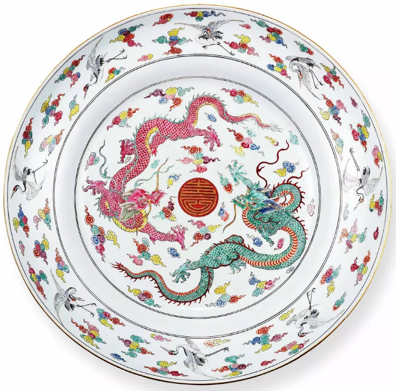 双龙分别以胭脂红与淡松石绿描绘,色彩淡雅,对比鲜明。双龙捧寿,象征皇图永固,万寿无疆。