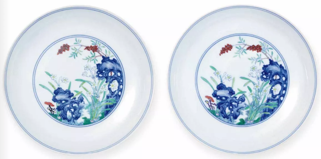 本盘敞口,弧壁,圈足。盘心及外壁皆以釉下青花绘山石并勾勒花卉枝叶,继以釉上红、黄、绿、赭石等色彩填绘。洞石之上有天竺横欹而出,下见水仙吐萼含苞,灵芝倚石而生,整个画面春意盎然,若和风拂面,醉人心扉。