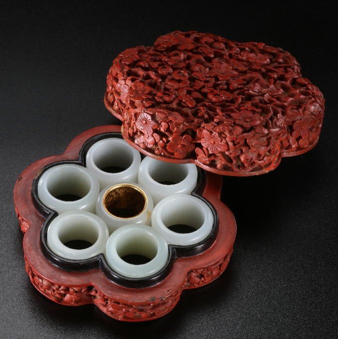 还有可以体现华夏首拍高水准的顶尖精品——清乾隆年间的白玉御题诗扳指(共七件)带剔红盖盒。七枚扳指上内容丰富,做工精湛,剔红盒上满雕缠枝梅花,匠心独具,贵气逼人,为典型乾隆宫廷的气息。华夏拍卖的这件拍品是从未在拍场上公开出现过的一件生货,为欧洲一家老户所旧藏。类似的藏品,除了两岸故宫外,民间所藏一件在2007年香港苏富比拍出了4736万港元的高价!