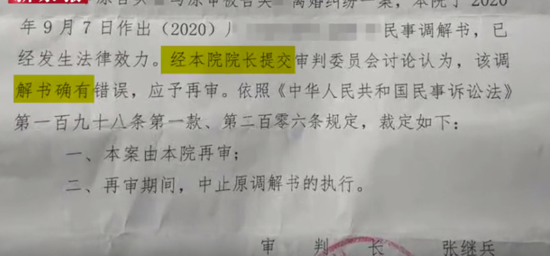 12月7日,大竹县法院裁定,9月7日作出的原离婚调解书有错误,应予再审,再审期间中止原调解书的执行。
