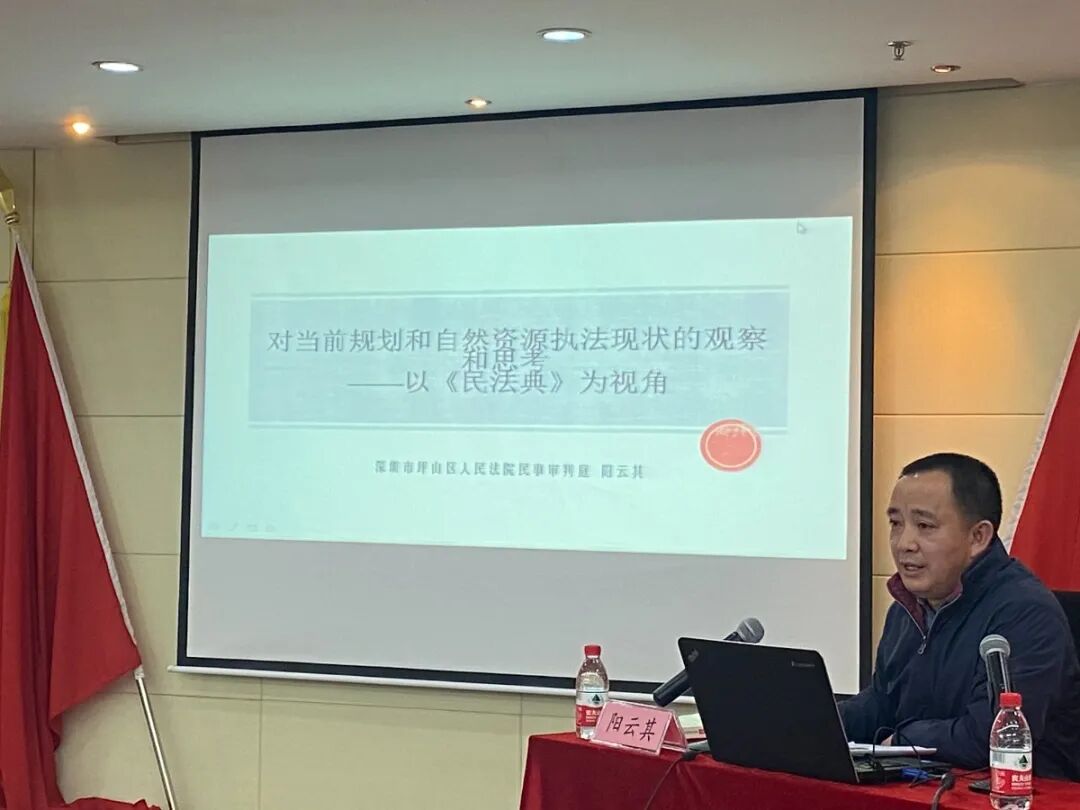 为进一步规范行政行为、推进依法行政,增强法治意识,近日,受深圳市规划和自然资源局龙岗管理局的邀请,坪山法院民事审判庭庭长阳云其为该局作主题为“对当前规划和自然生态执法现状的观察和思考——以民法典为视角”的法律专题讲座。龙岗管理局肖纯副局长、杨宁副总师及相关科室人员参加讲座。